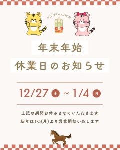誠に勝手ながら、令和7年12月27日(土)~令和8年1月4日(日)まで年末年始休業とさせていただきます。